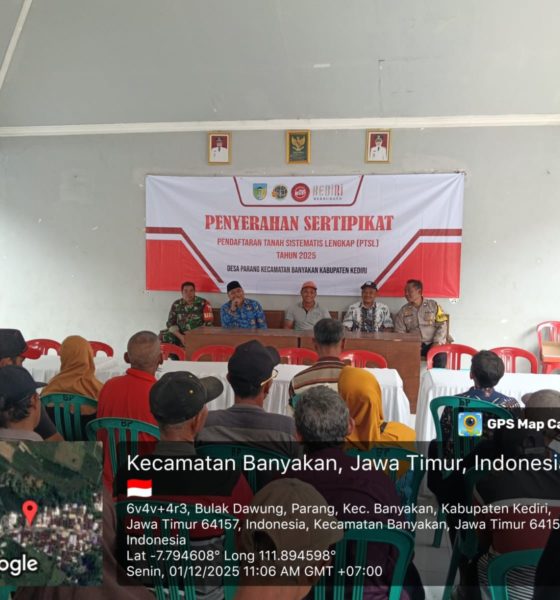 Polreskedirikota.com – Proses penyerahan Sertipikat Pendaftaran Tanah Sistematis Lengkap (PTSL) Tahun 2025 untuk warga Desa Parang, Kecamatan Banyakan, Kabupaten Kediri berlangsung lancar dan tertib pada Senin (1/12/2025). Kegiatan yang digelar di Balai Desa Parang tersebut dihadiri ratusan warga penerima sertipikat serta unsur pemerintah desa dan aparat keamanan.