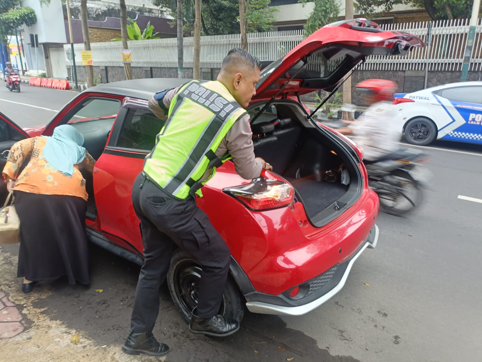 Tidak lama berselang, suami pengendara juga tiba di lokasi setelah sebelumnya dihubungi melalui telepon untuk memberikan pendampingan lebih lanjut.