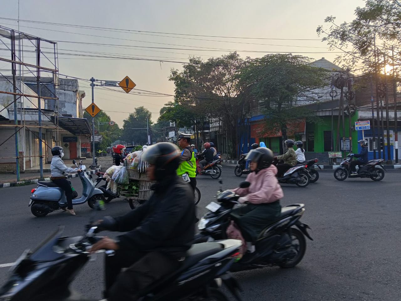 Petugas melaksanakan kegiatan pengaturan dan penyeberangan kepada masyarakat yang akan melaksanakan kegiatan di pagi hari di wilayah hukum Polsek Mojoroto.