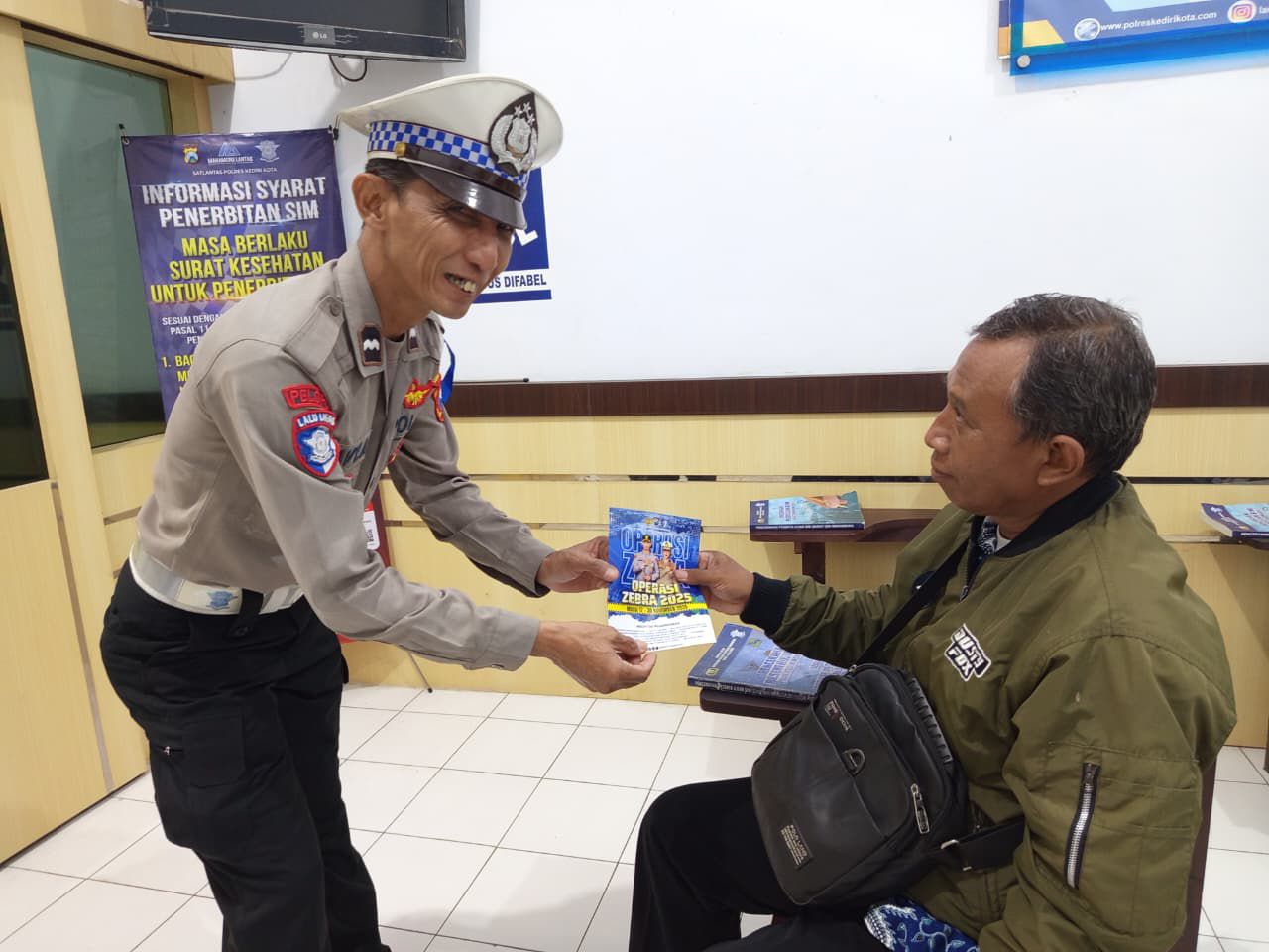 Kediriselaludihati.com – Satuan Lalu Lintas Polres Kediri Kota terus memperluas jangkauan sosialisasi Operasi Zebra Semeru 2025 dengan membagikan brosur keselamatan kepada para pemohon Surat Izin Mengemudi (SIM) di Satpas Polres Kediri Kota, Kamis (27/11/2025). Kegiatan berlangsung pada pukul 10.00–11.00 WIB dipimpin Unit Kamsel Satlantas bersama anggota.