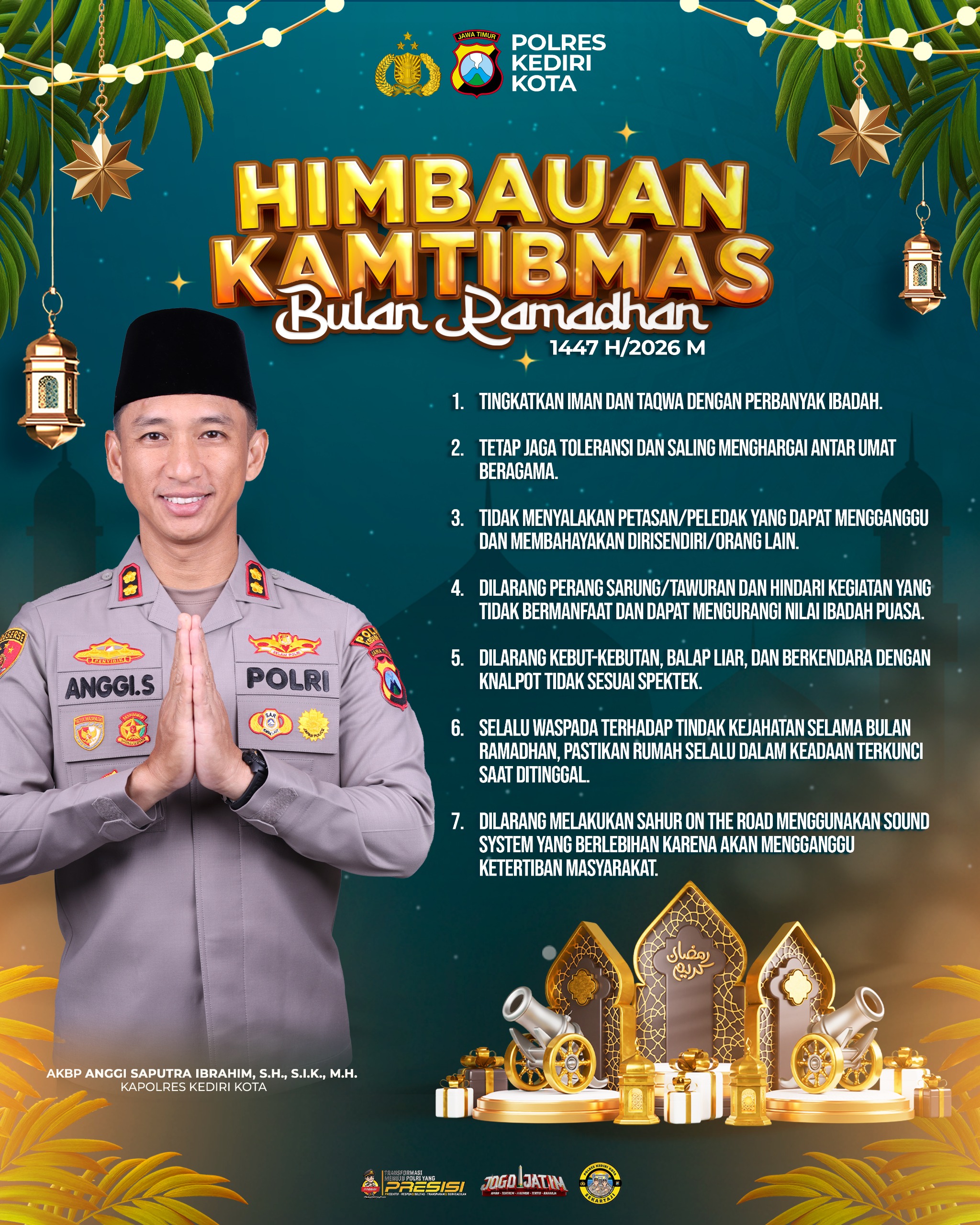 Kediriselaludihati – Kepala Kepolisian Resor Kediri Kota, Anggi Saputra Ibrahim, S.H, S.IK, M.H menyampaikan himbauan keamanan dan ketertiban masyarakat (kamtibmas) kepada seluruh warga di wilayah hukum Polres Kediri Kota dalam rangka menjaga situasi yang aman, tertib, dan kondusif selama Bulan Suci Ramadhan 1447 Hijriah atau 2026 Masehi.