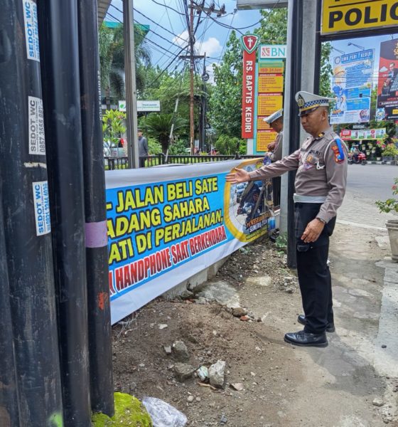 Kediriselaludihati- Satuan Lalu Lintas (Satlantas) Polres Kediri Kota memasang banner imbauan dan membagikan brosur keselamatan lalu lintas di sejumlah titik strategis, Selasa (3/2/2026). Kegiatan ini merupakan bagian dari Satgas Preemtif Operasi Keselamatan 2026 yang bertujuan meningkatkan kesadaran masyarakat dalam berlalu lintas.