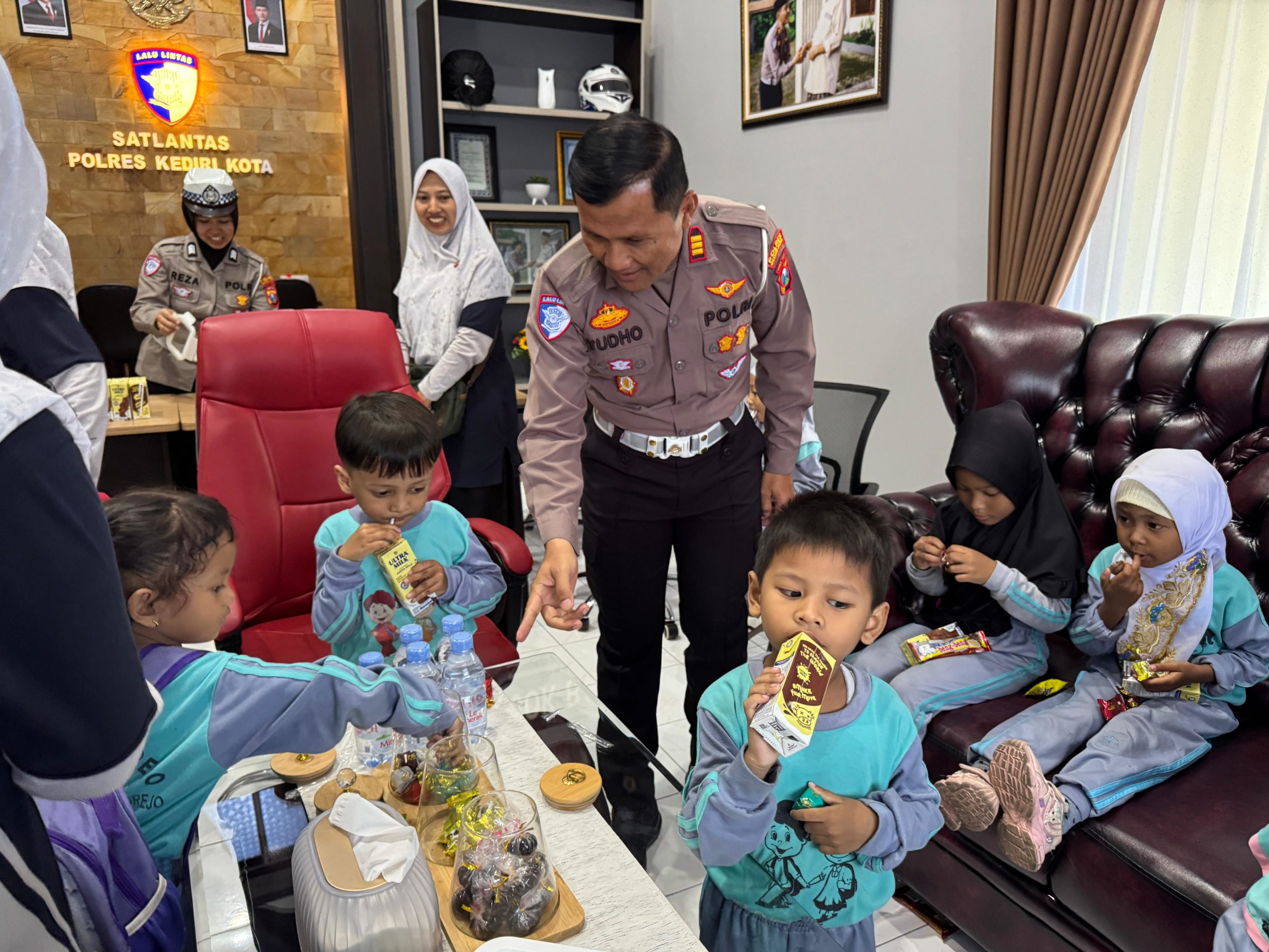 Kediriselaludihati.com – Satuan Lalu Lintas (Satlantas) Polres Kediri Kota menerima kunjungan guru dan siswa-siswi KB PKK Sambirejo Kediri di Ruangan Kasat Lantas Polres Kediri Kota, pada Rabu (29/4/2026). Kegiatan yang berlangsung pukul 09.30 WIB hingga 10.30 WIB tersebut menjadi bagian dari upaya penguatan edukasi keselamatan berlalu lintas kepada anak usia dini.