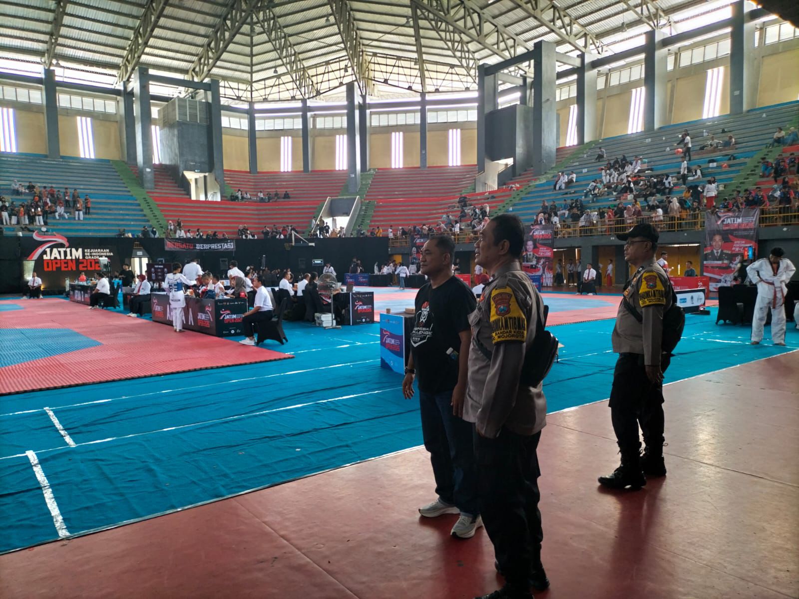 Kediriselaludihati.com – Bhabinkamtibmas Kelurahan Bandar Kidul, Polsek Mojoroto, Polres Kediri Kota Aiptu Sugiono bersama personel Polsek Mojoroto dan anggota Kodim 0809 Kediri melakukan pengamanan Kejuaraan Nasional Taekwondo Grade B Jatim Open 2025 di GOR Joyoboyo, Jumat (21/11). Kegiatan dimulai sejak pukul 07.00 WIB dan diikuti lebih dari 2.000 peserta dari berbagai daerah.