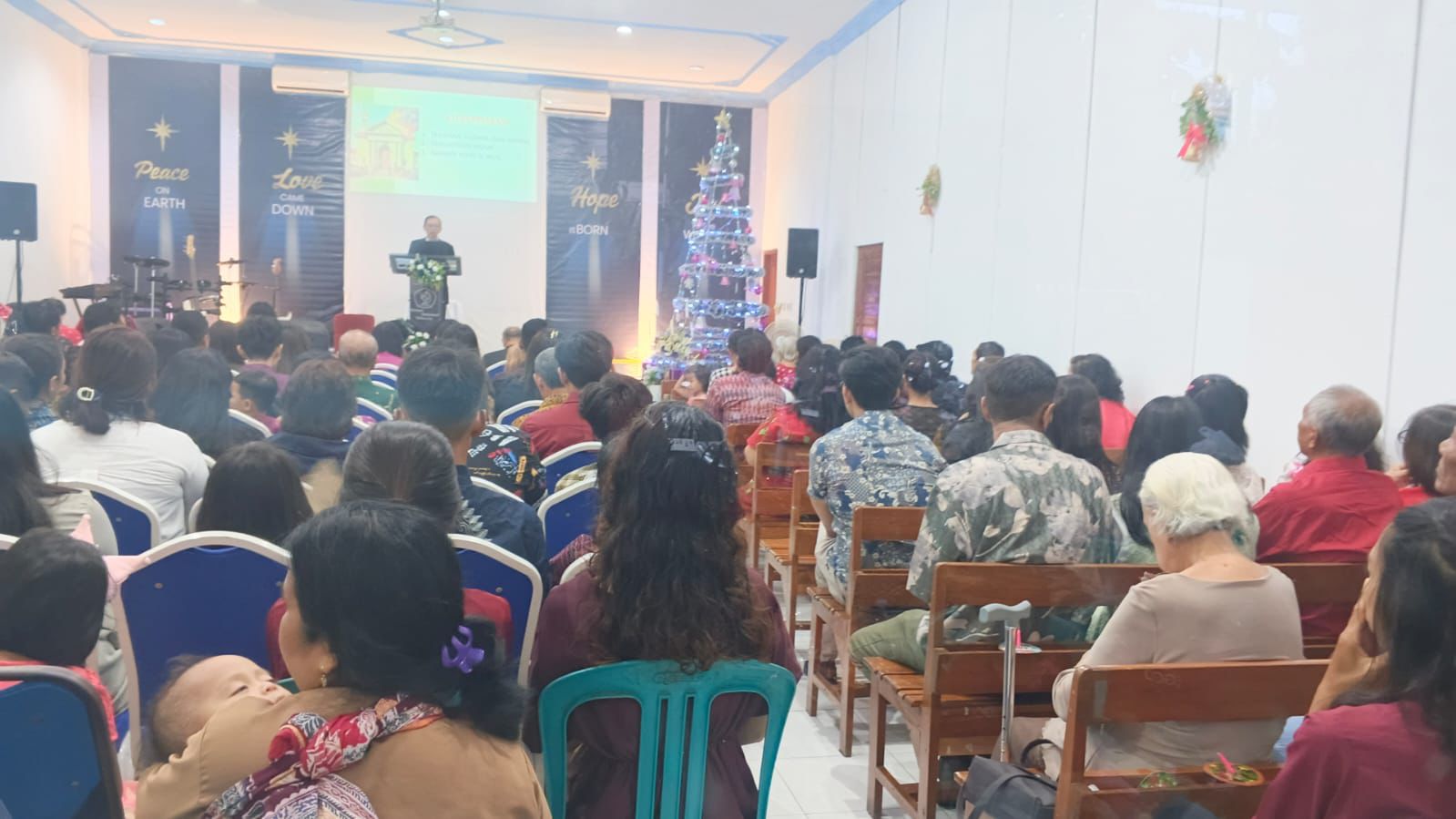 Ibadah Natal di Gereja Immanuel dipimpin oleh Pendeta Harun dengan mengusung tema “Waktu Perkenanan Tuhan.” Sekitar 150 jemaat mengikuti ibadah dengan penuh kekhusyukan.