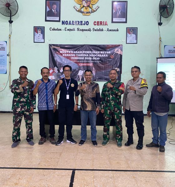 KediriSelaluDiHati – Bhabinkamtibmas Kelurahan Ngadirejo Polsek Kediri Kota, Aiptu Bekti Purwanto, bersama unsur tiga pilar menghadiri kegiatan Musyawarah Karang Taruna “Neo Caraka” yang dirangkaikan dengan pemilihan Ketua Karang Taruna Kelurahan Ngadirejo periode 2026–2030. Kegiatan tersebut berlangsung di Gedung Pertemuan Kelurahan Ngadirejo, Kota Kediri, Kamis (8/1/2026) malam.