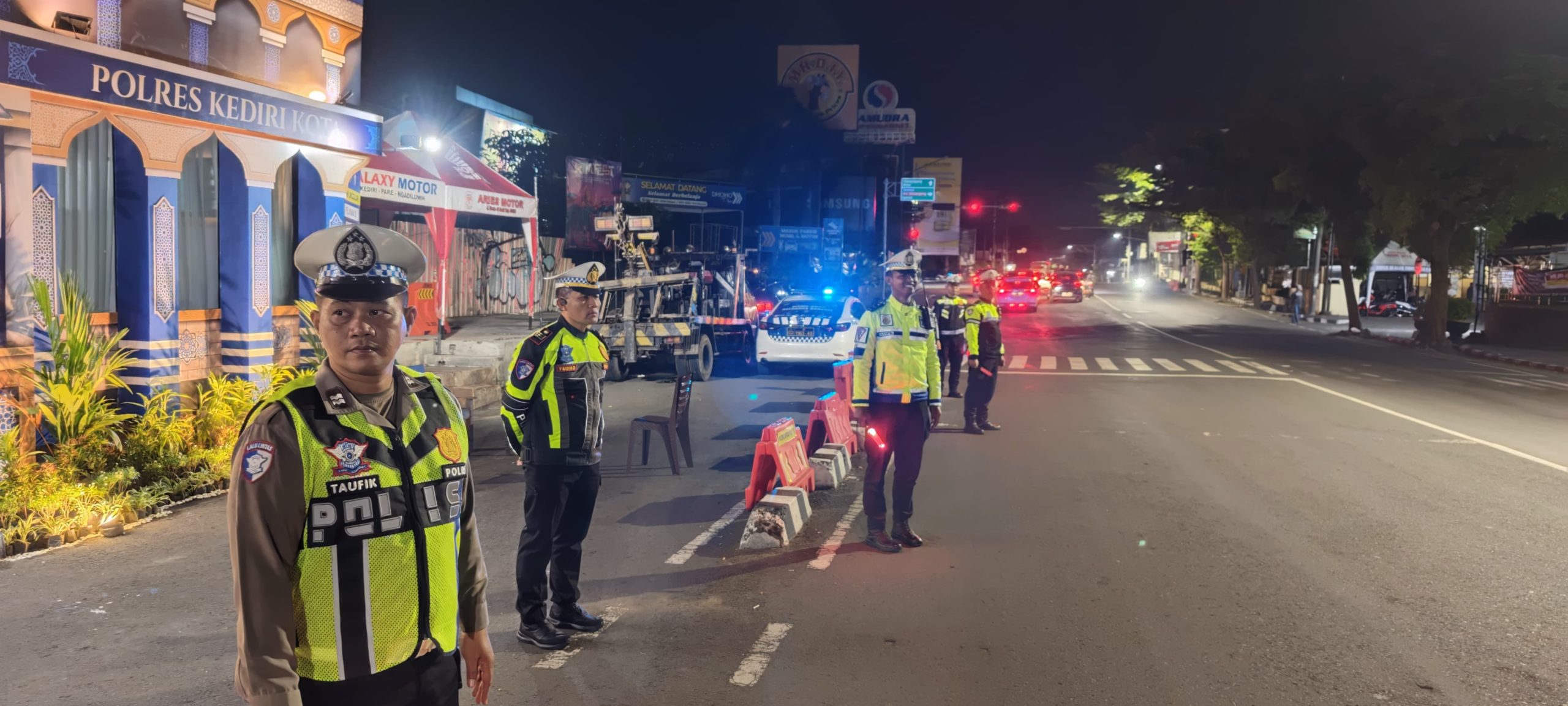 Selain menyasar objek vital, personel kepolisian turut memantau arus lalu lintas di sejumlah jalan protokol di wilayah Kecamatan Kota Kediri guna memastikan kelancaran mobilitas kendaraan pada malam hari.
