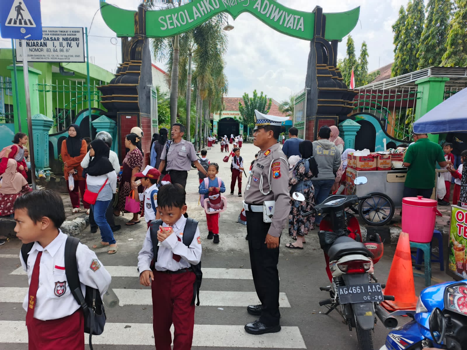 Kegiatan tersebut dilaksanakan oleh Unit Lantas Polsek Kediri Kota sebagai bentuk pelayanan langsung kepada masyarakat, khususnya anak-anak sekolah yang rawan terpapar risiko kecelakaan lalu lintas pada jam padat kendaraan. Di lokasi, petugas tampak aktif mengatur arus kendaraan, membantu pelajar menyeberang jalan, serta memantau situasi lalu lintas agar tetap tertib dan aman.